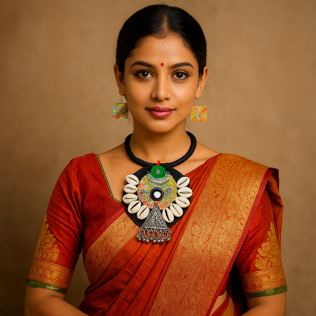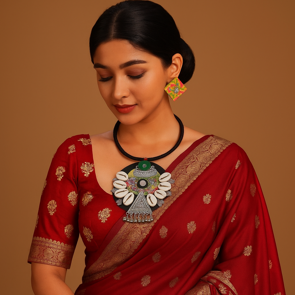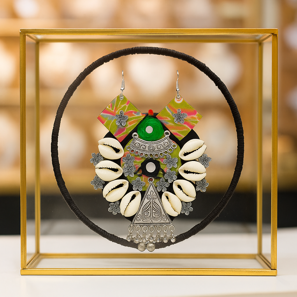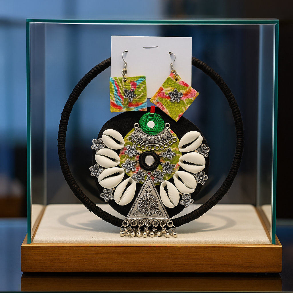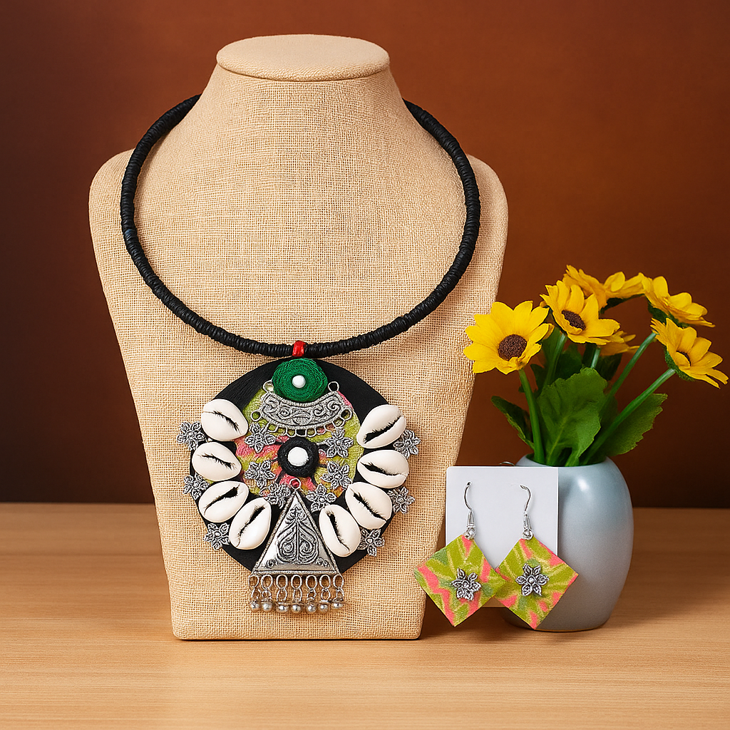 Pendant Design: Large round pendant with black and green embroidery, cowrie shell border, and silver-tone oxidized charms with a jhumka-style drop