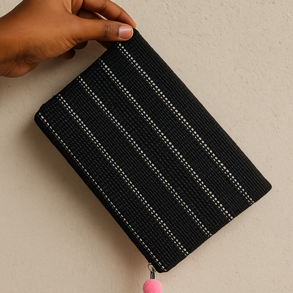 Material: Made from strong and eco-friendly jute fabric with a deep black base and white vertical stripe detailing