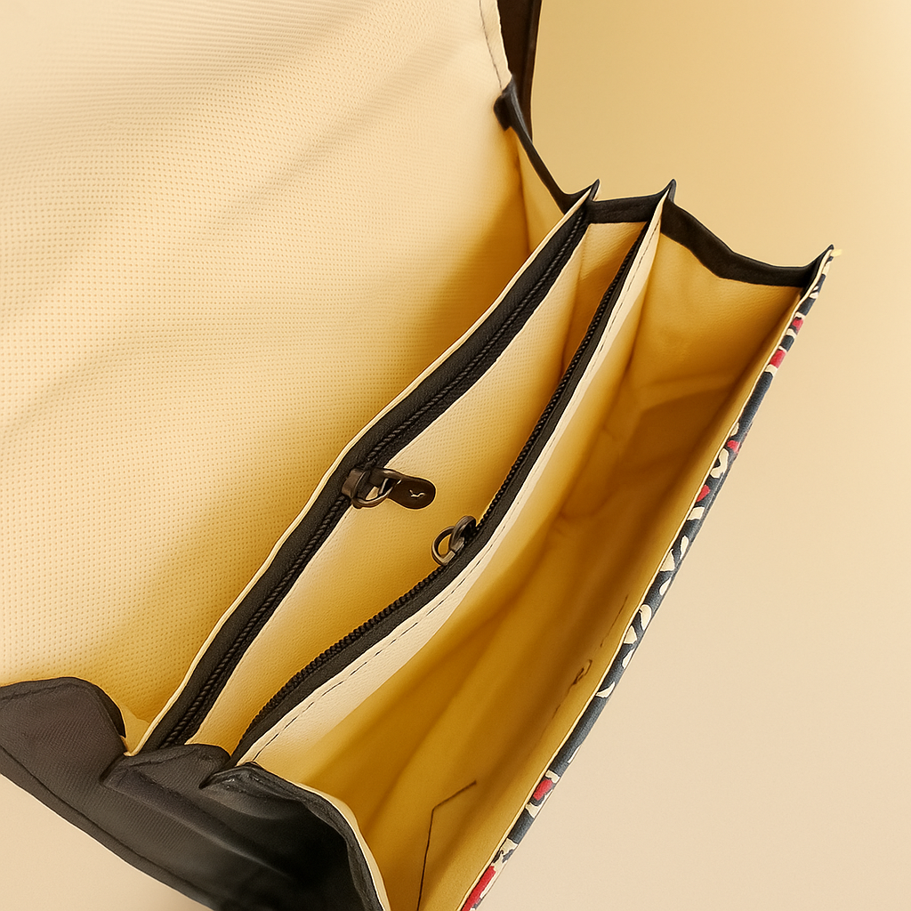 Material: Tribal-printed cotton canvas body paired with faux leather flap and strap