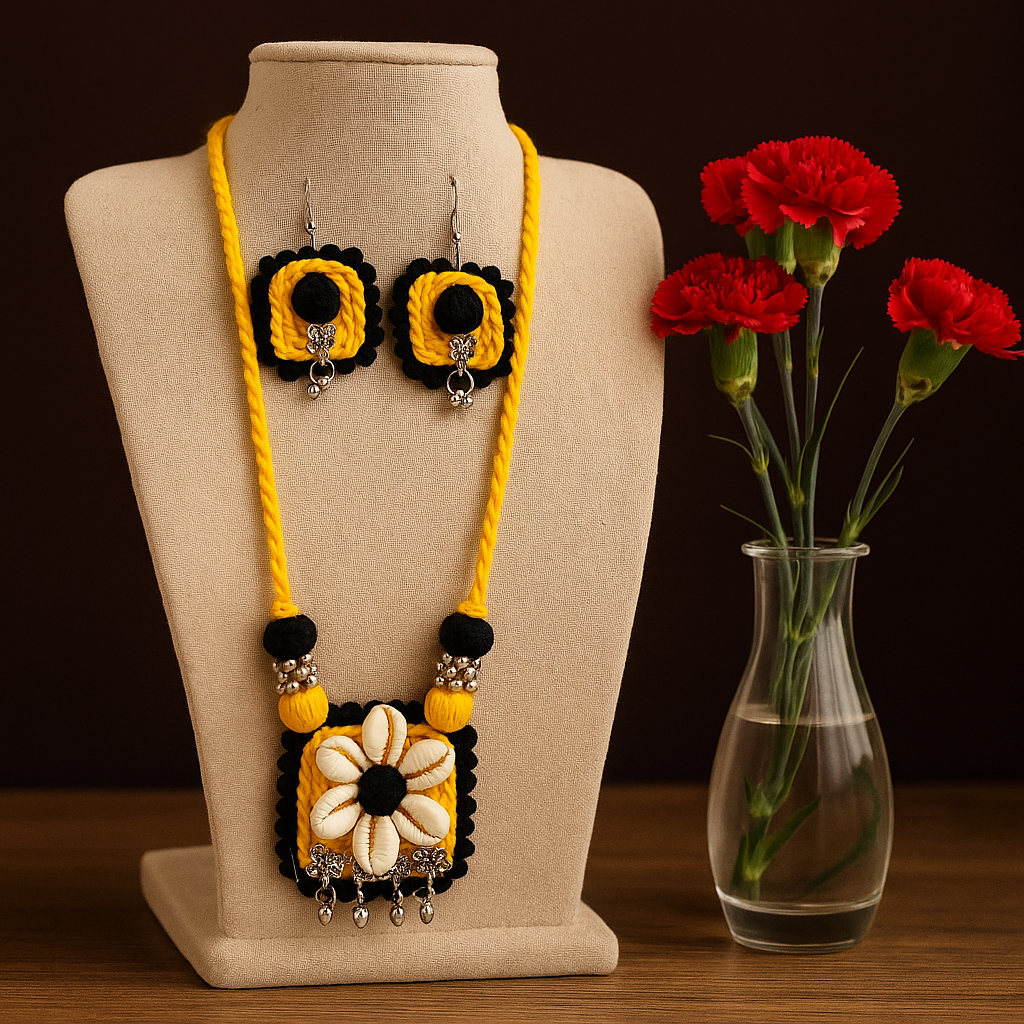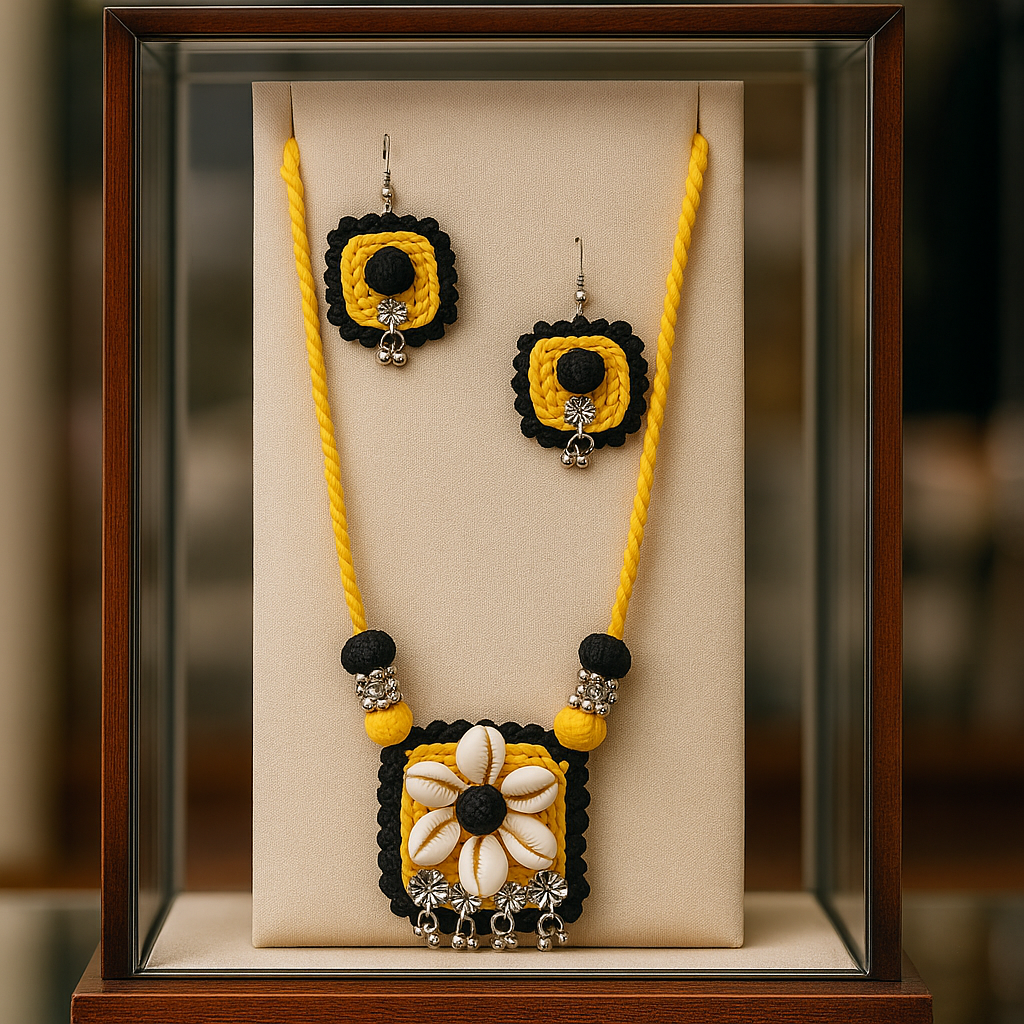 Pendant Design: Square pendant with floral cowrie shell motif, bordered in black & yellow with silver danglers