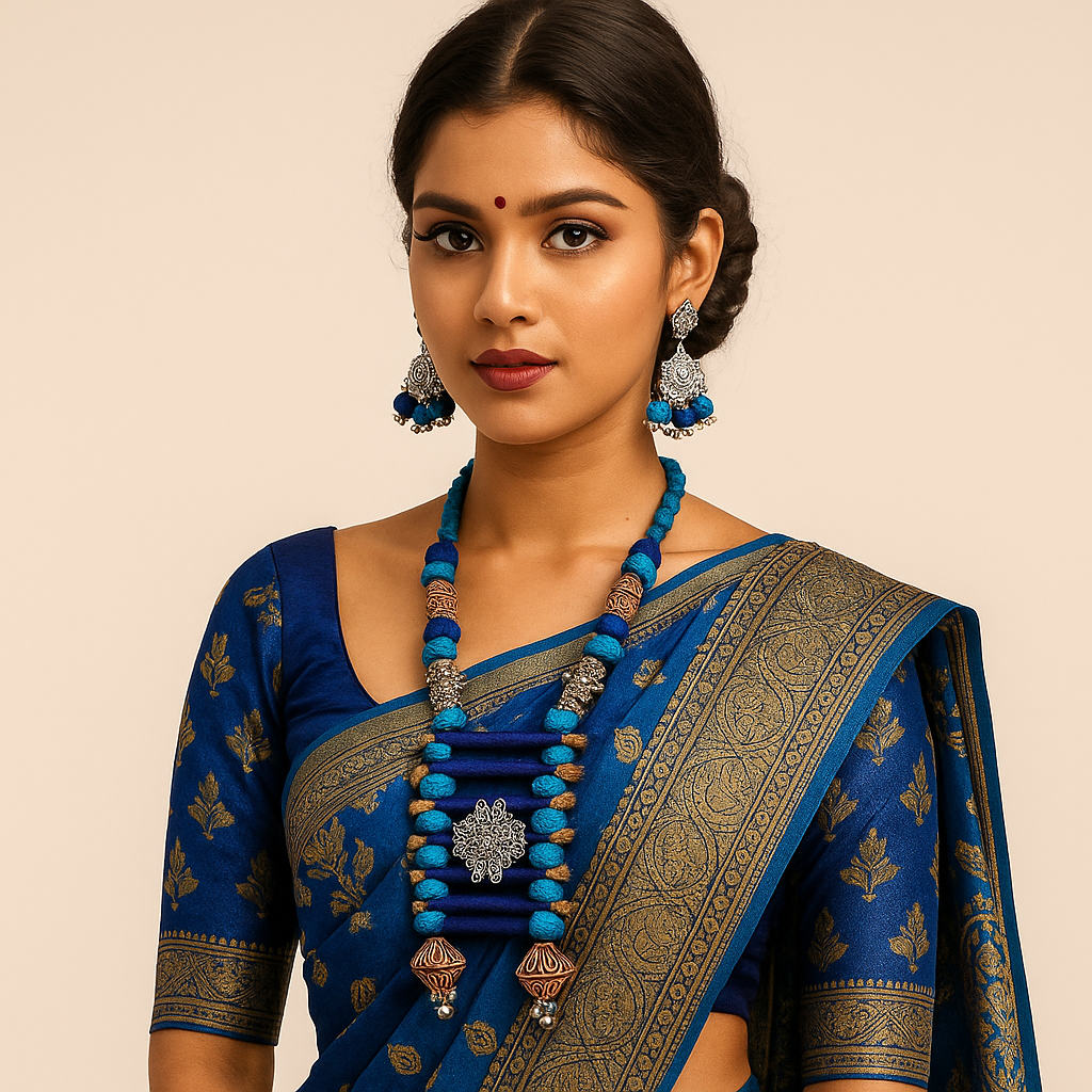 Earrings: Matching oxidized silver jhumka-style earrings with blue wool bead detailing