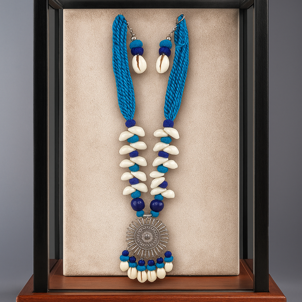 Decorative Elements: White shells, blue wooden beads, small silver ghungroos