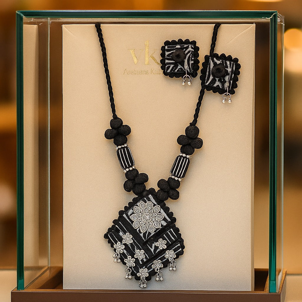 Material: Woven cotton thread, oxidized metal centerpiece, fabric backing