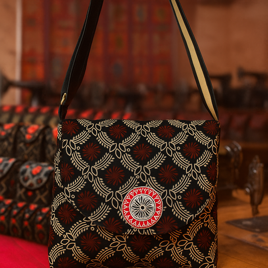 Design: Traditional red and beige motifs with a central mandala embroidery