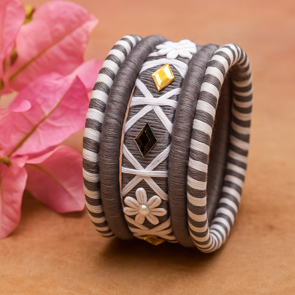 Grey and white dual-tone bangles with neat silk thread wrapping