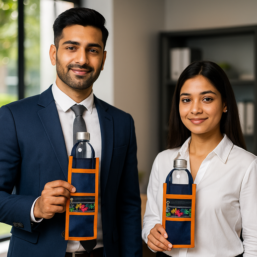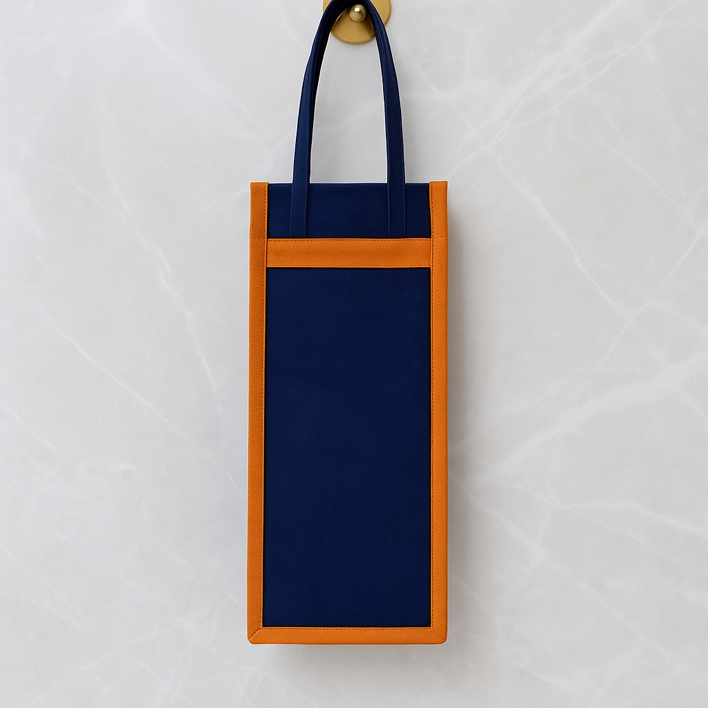 Design: Navy blue body with bright orange border and colorful floral embroidery strip