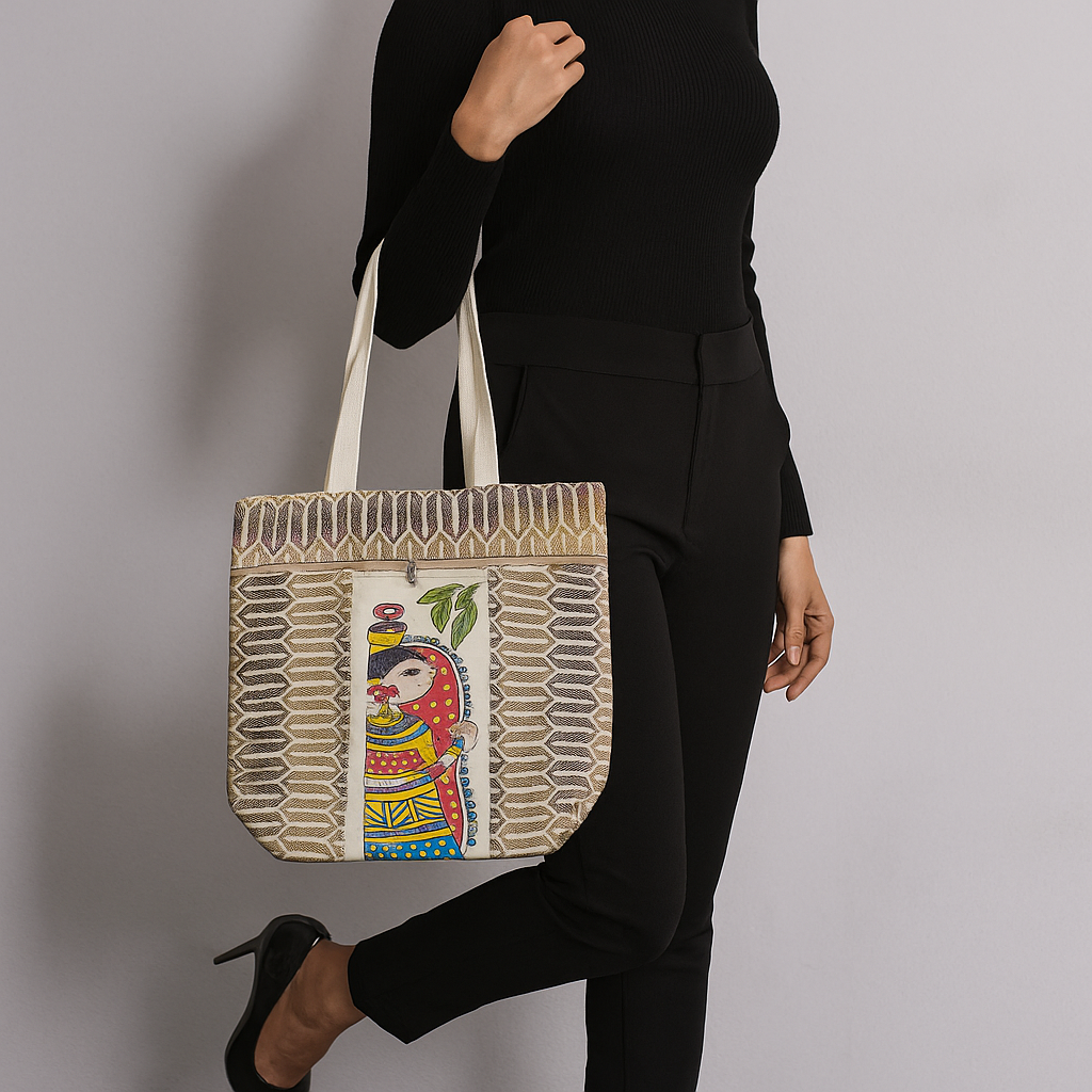Make a bold statement with our Ethnic Warrior Art Jute Tote, featuring a vibrant traditional warrior motif handprinted on eco-friendly jute. This compact 14x14 cm bag is perfect for carrying your daily essentials with style. The intricate white side stitch design and colorful tribal artwork reflect the richness of Indian heritage.