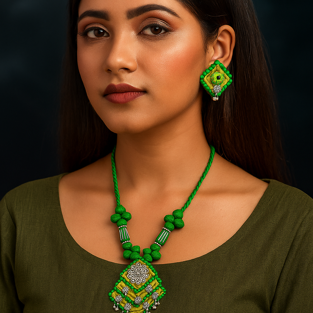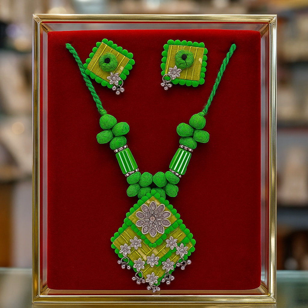 Necklace: Dual-tone (green & yellow) layered square pendant with central oxidized silver floral motif and hanging charms