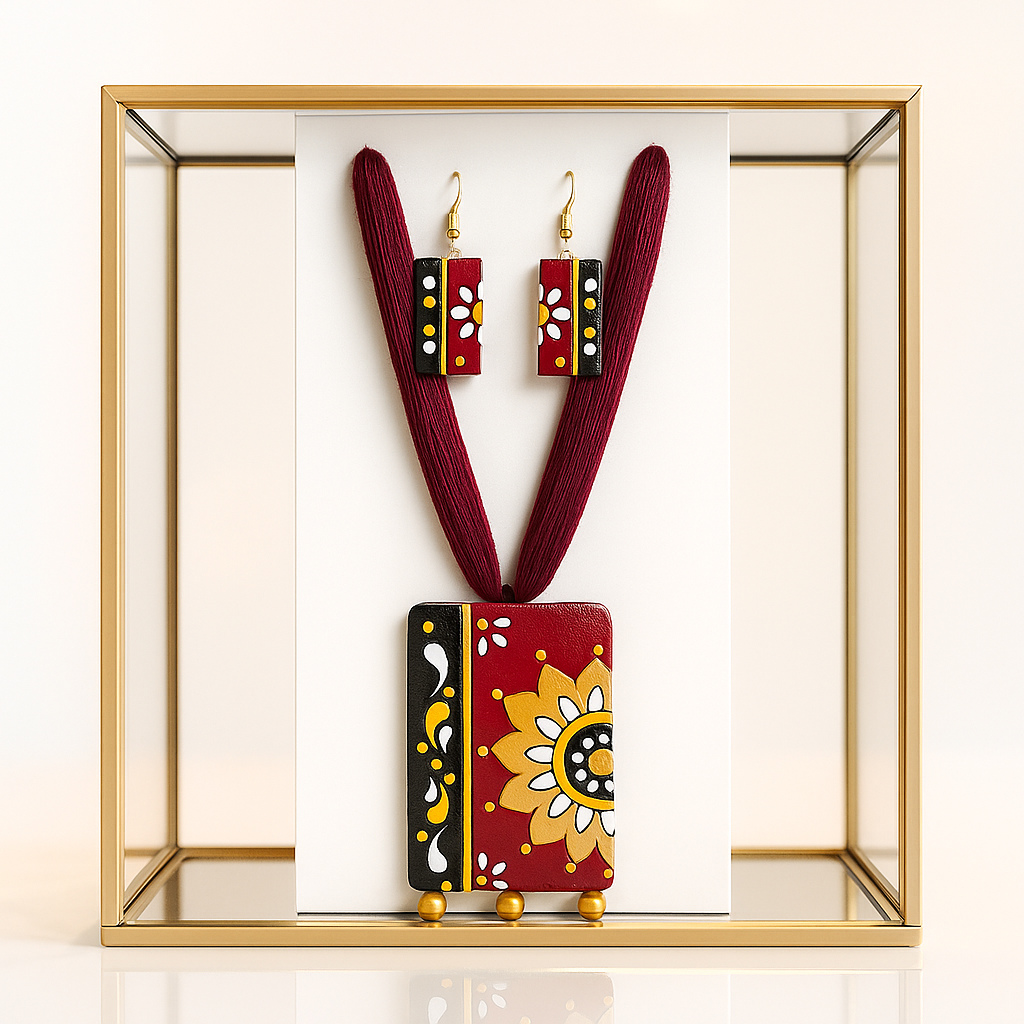 Design Theme: Bold floral motif in yellow, white & black on red-maroon base