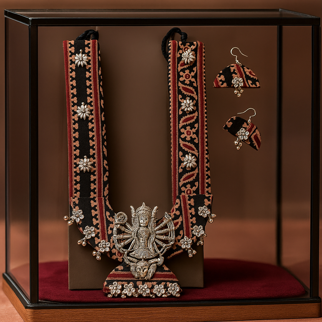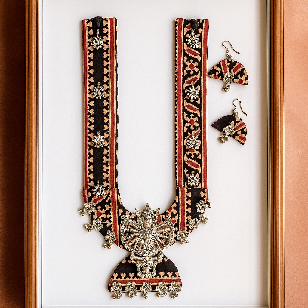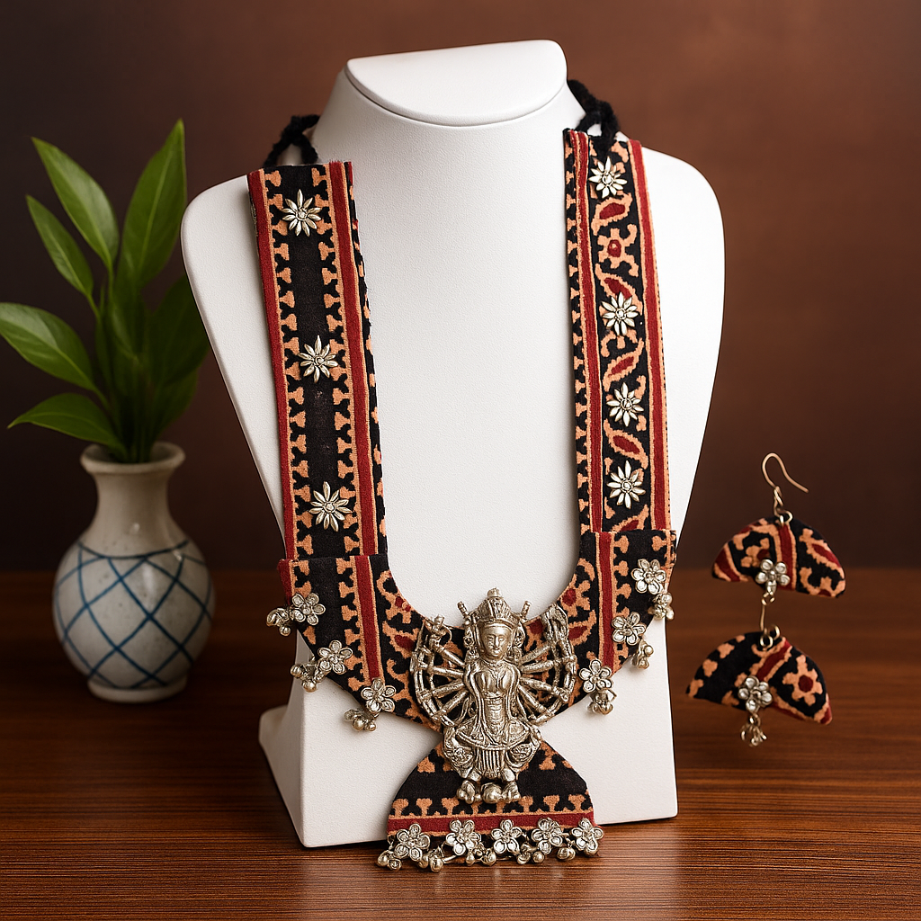 Pendant Design: Large goddess Lakshmi motif with floral detailing and oxidized danglers