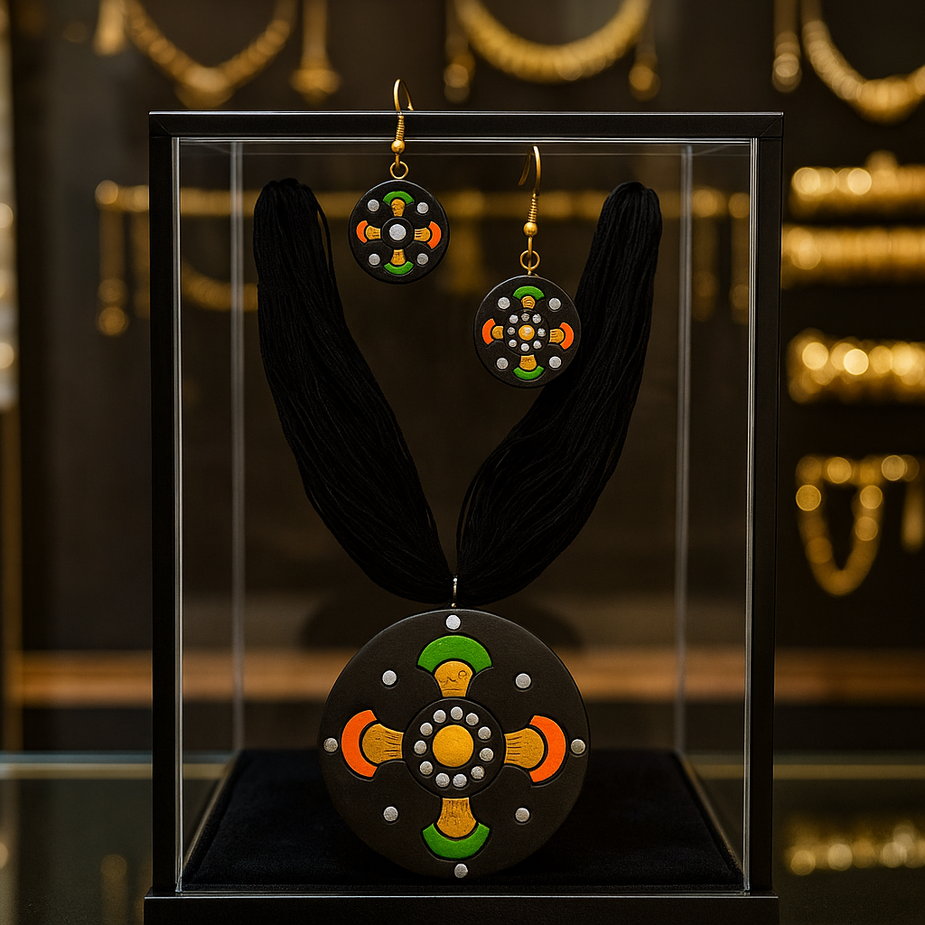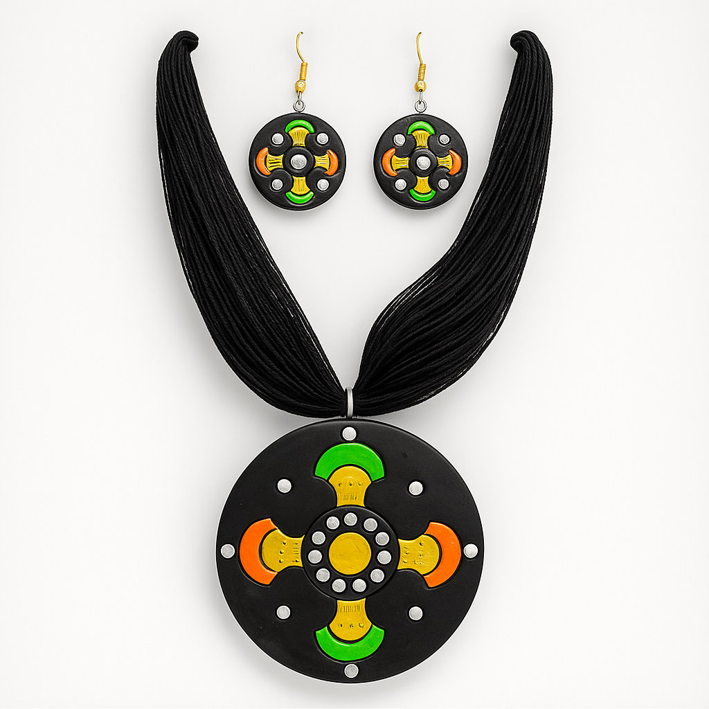 Design: Large circular pendant in black with orange, green, and yellow hand-painted details