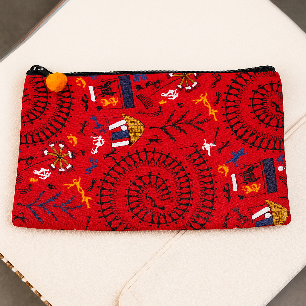 Stylish handmade red pouch with tribal print design. Multipurpose use for stationery, cosmetics, and travel essentials. Durable, eco-friendly, and artisan-crafted.