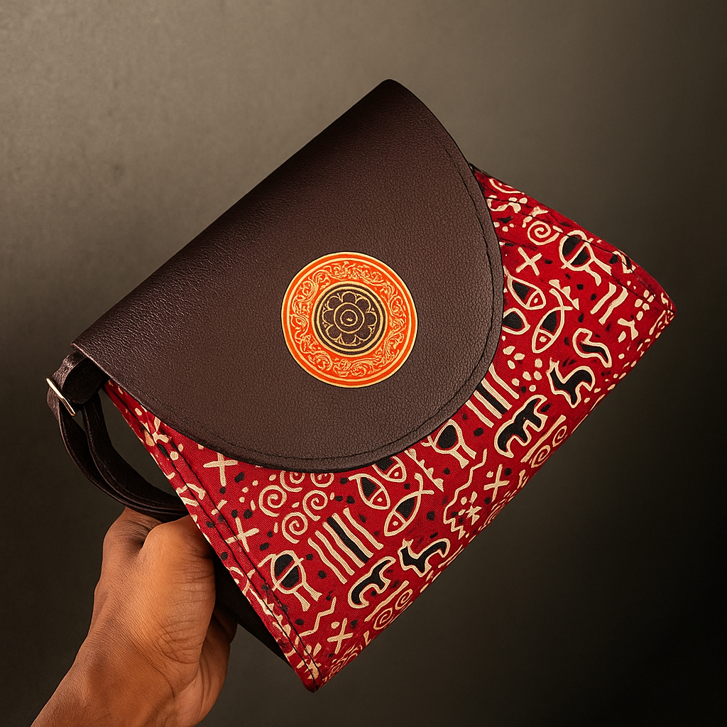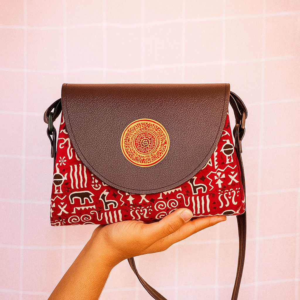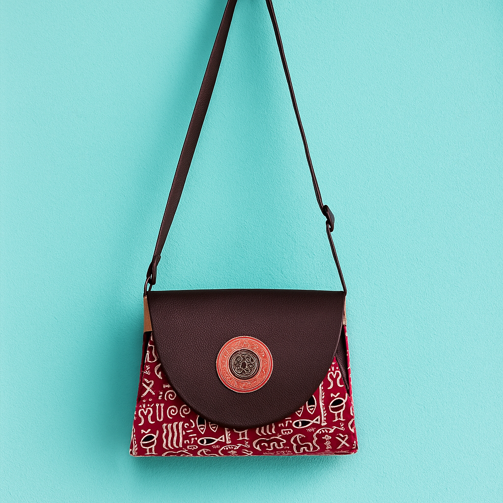 Design: Maroon base with white tribal symbols and rounded dark brown flap featuring a central mandala patch