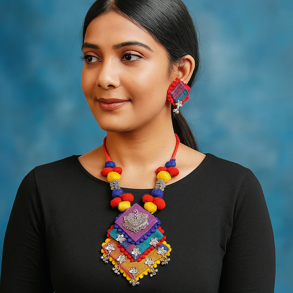 Necklace: Layered square-shaped multicolor pendant (yellow, red, blue, green) with oxidized silver floral motifs and dangling charms