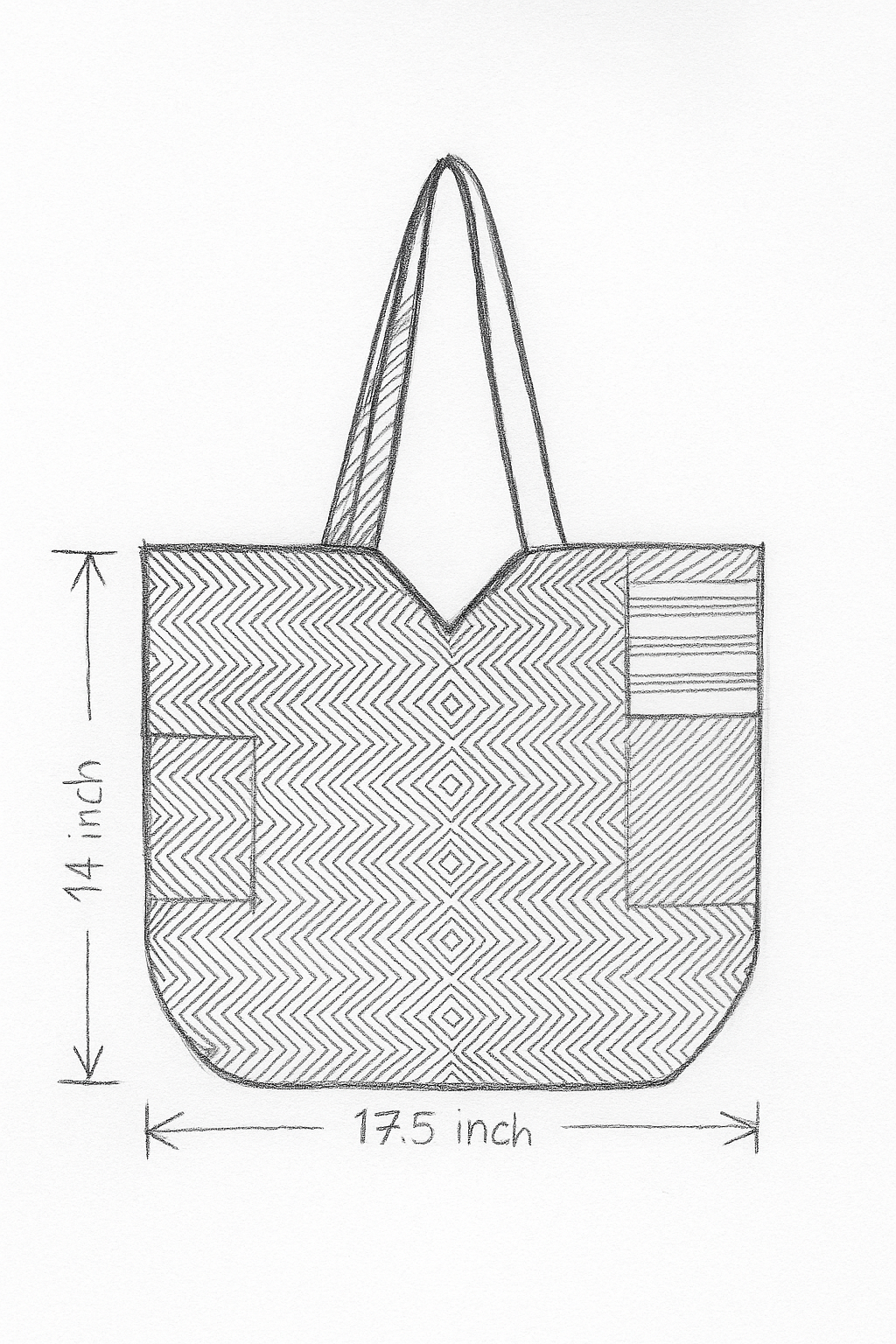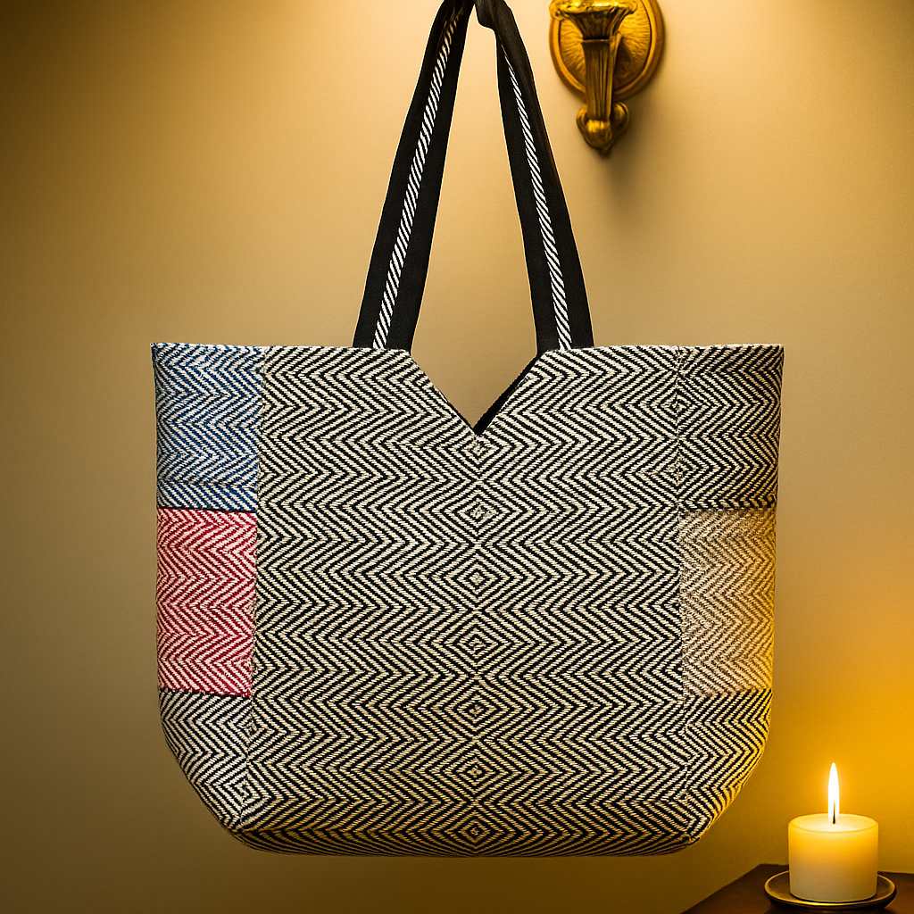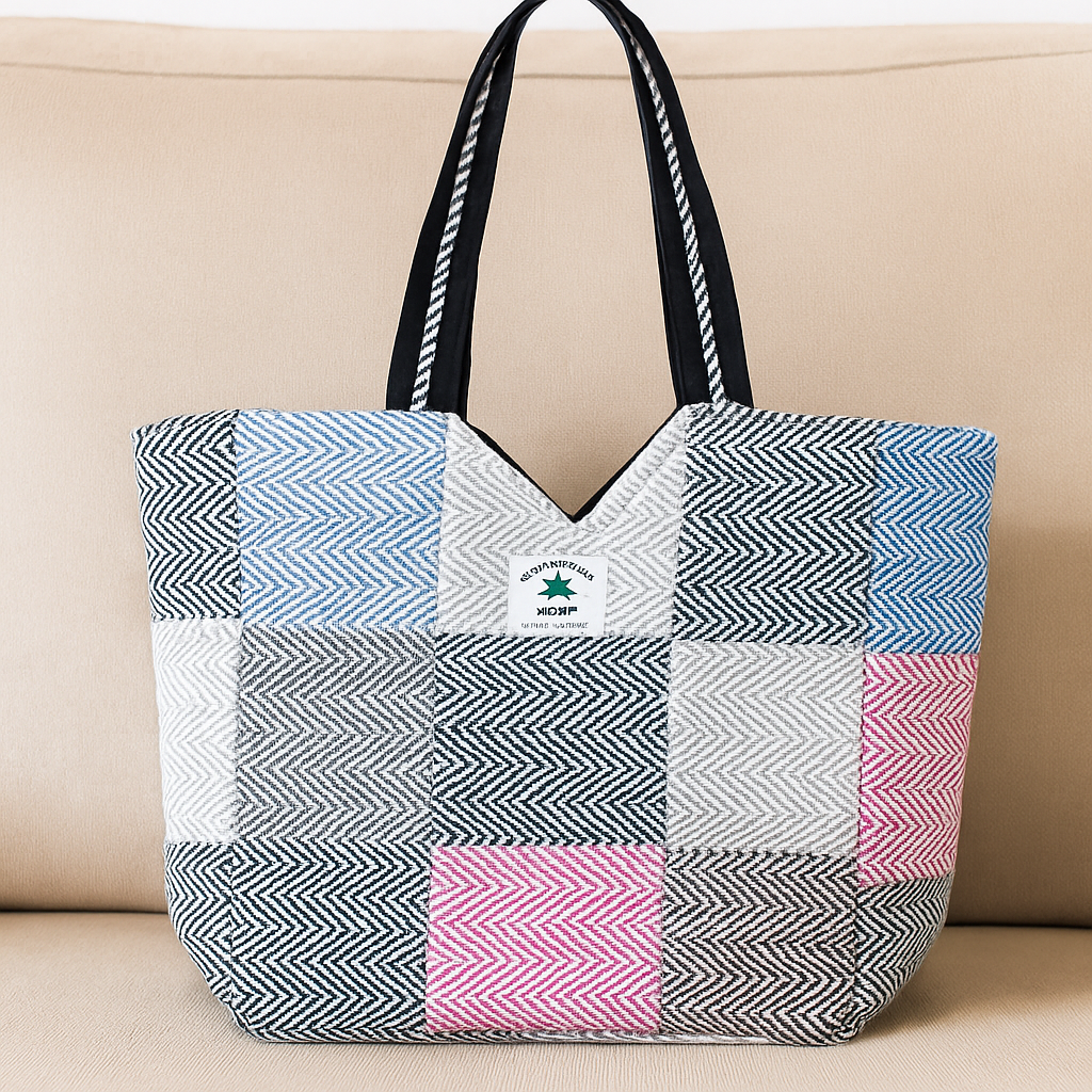 Design: Patch-style multicolor chevron weave in pink, blue, grey, and black