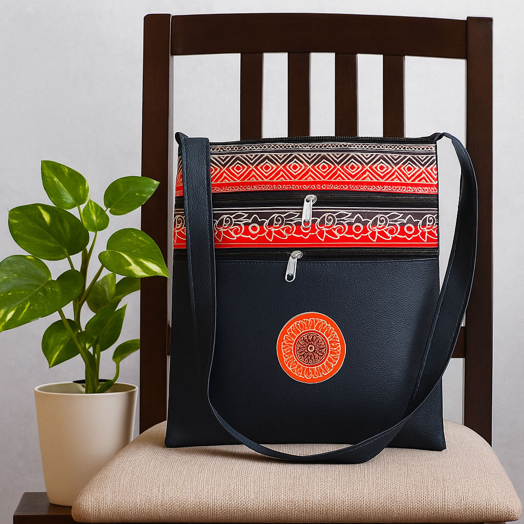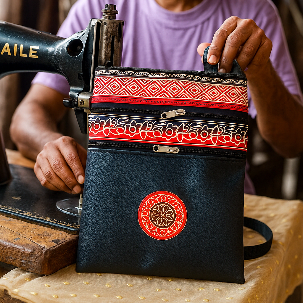 Design: Navy blue body with geometric and floral red-white tribal borders + central mandala patch