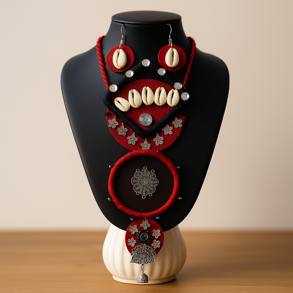 Pendant Design: Multi-layered pendant with square and round fabric sections, adorned with cowrie shells, oxidized motifs, and a jhumka drop