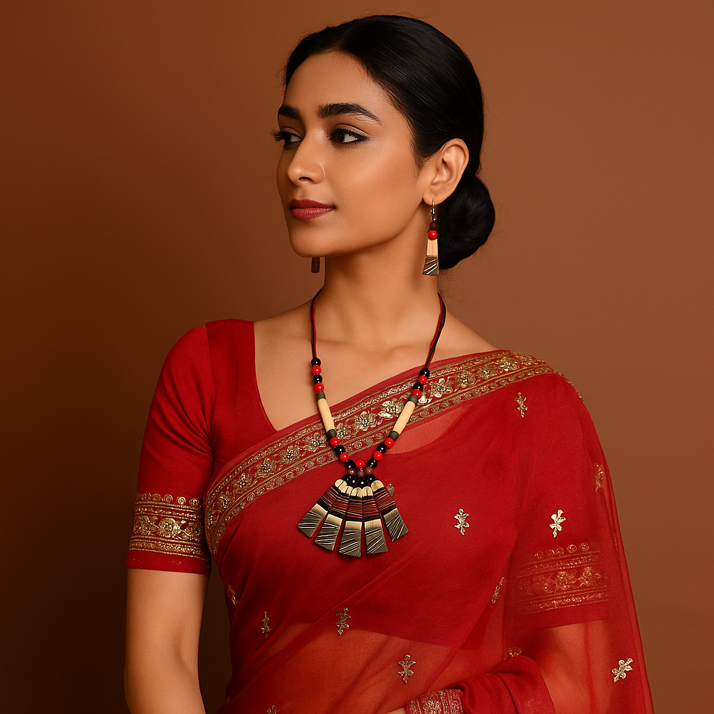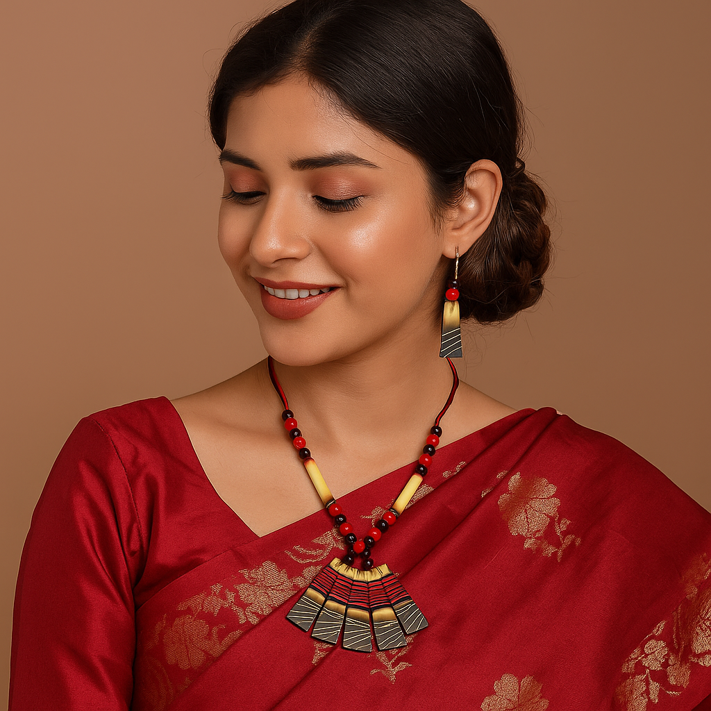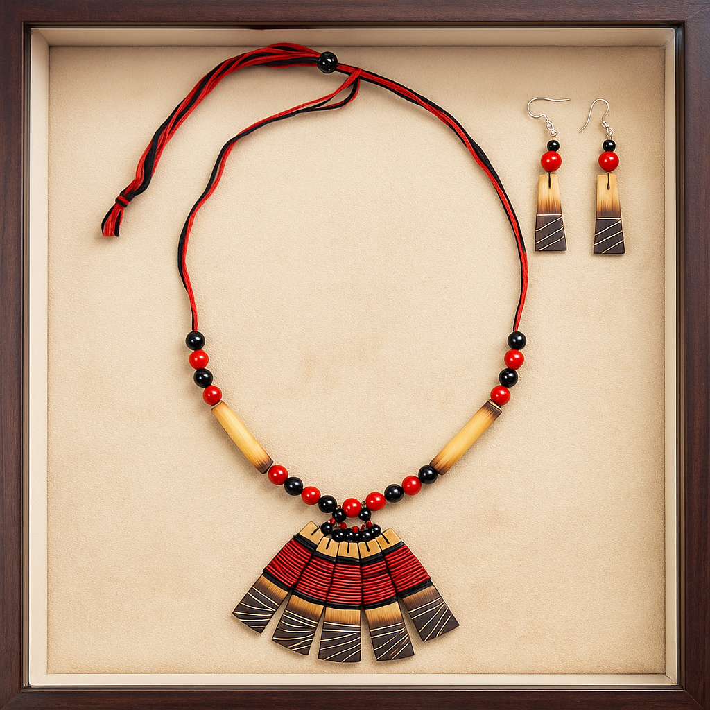 Bead Details: Alternating red, black, and brown round beads with two elongated bamboo beads