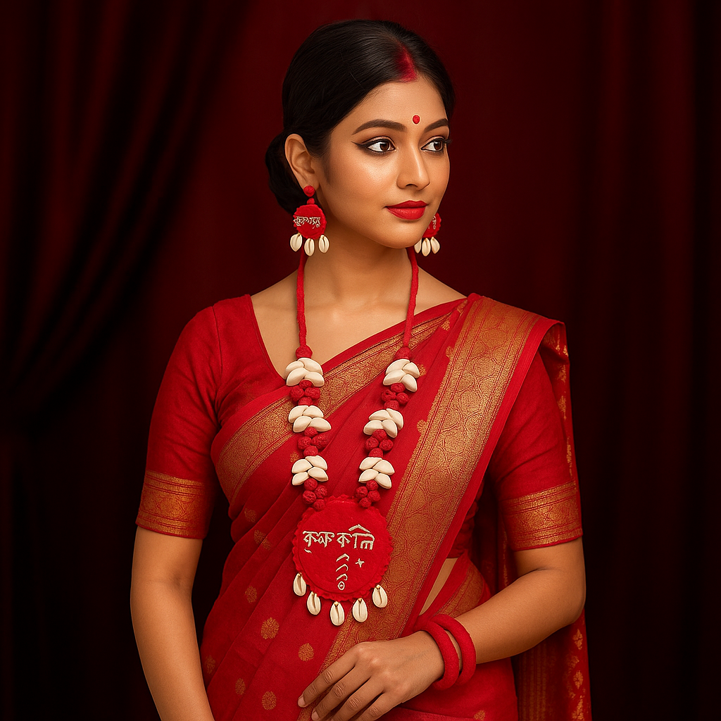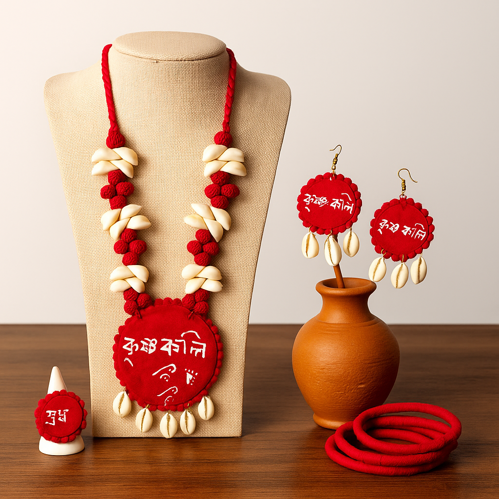 Pendant Design: Large circular red pendant with white embroidered Hindi text, cowrie shell drops, and matching smaller round earrings