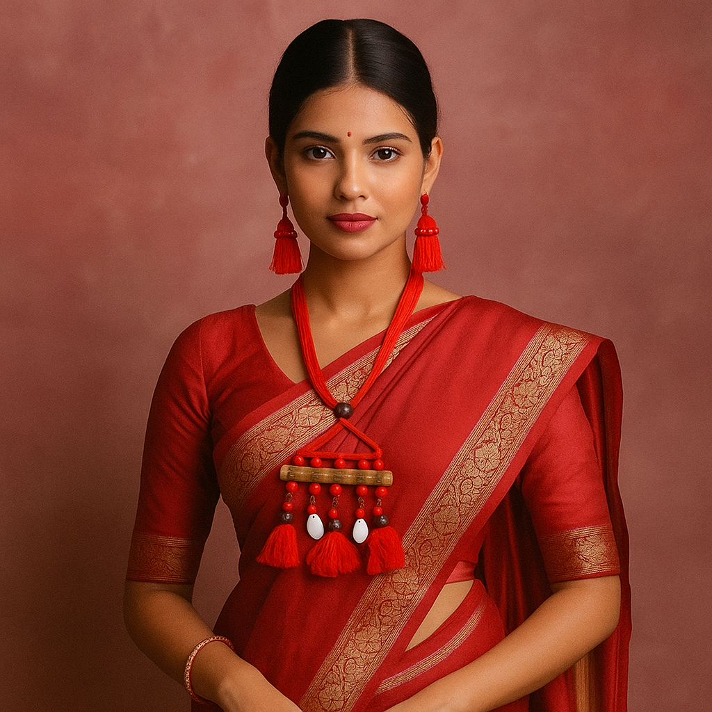 Pendant Design: Horizontal bamboo pendant with hanging red tassels, wooden beads, and cowrie shells
