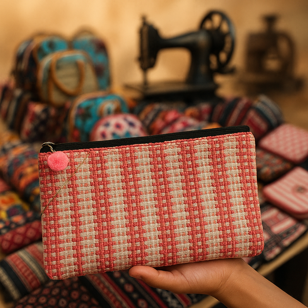 Handwoven by skilled artisans using premium, biodegradable jute. The alternating coral-red and natural stripes evoke the warmth of a sunrise, giving each pouch its unique handcrafted appeal. -