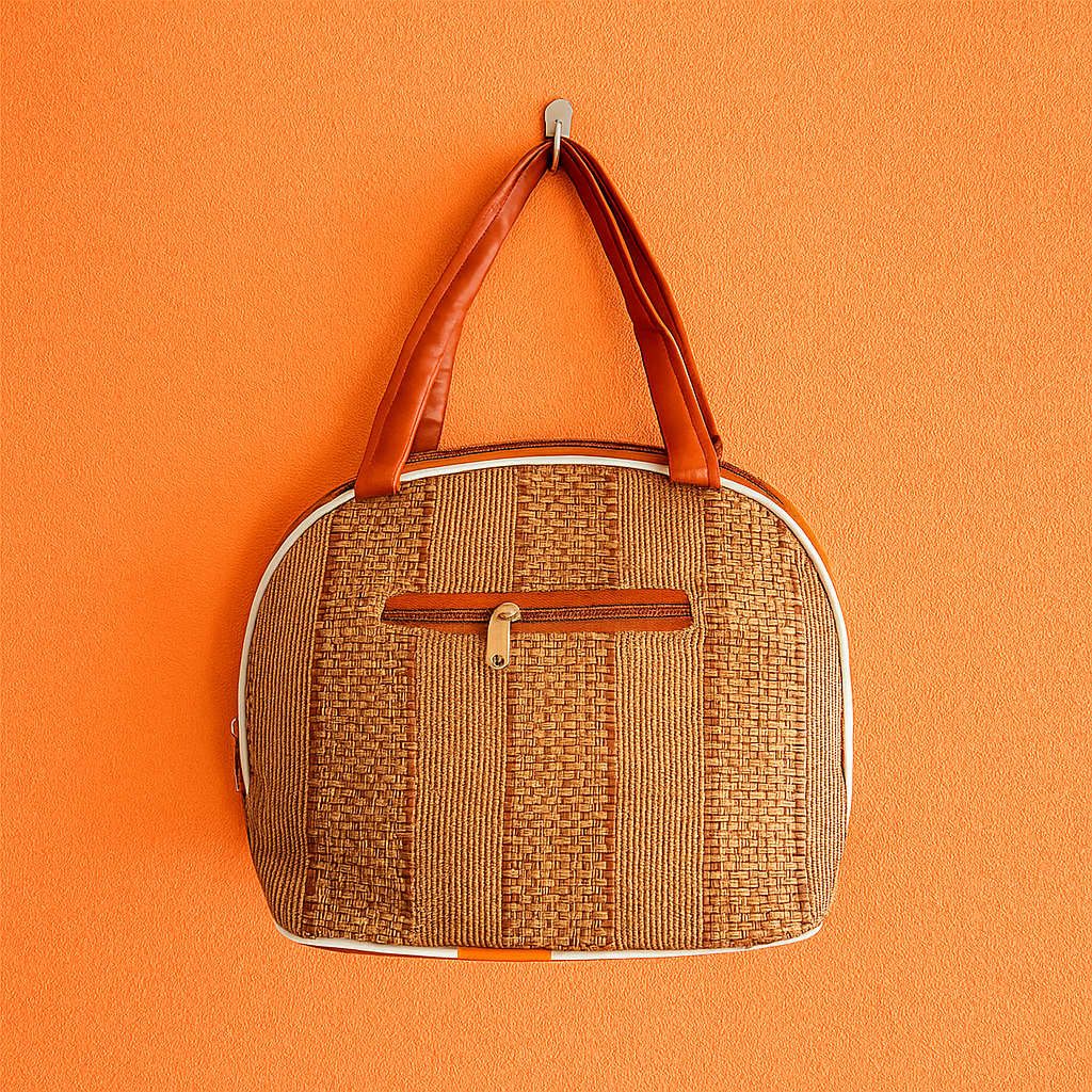 Design: Natural woven-look texture in brown with white piping and sleek zip pocket